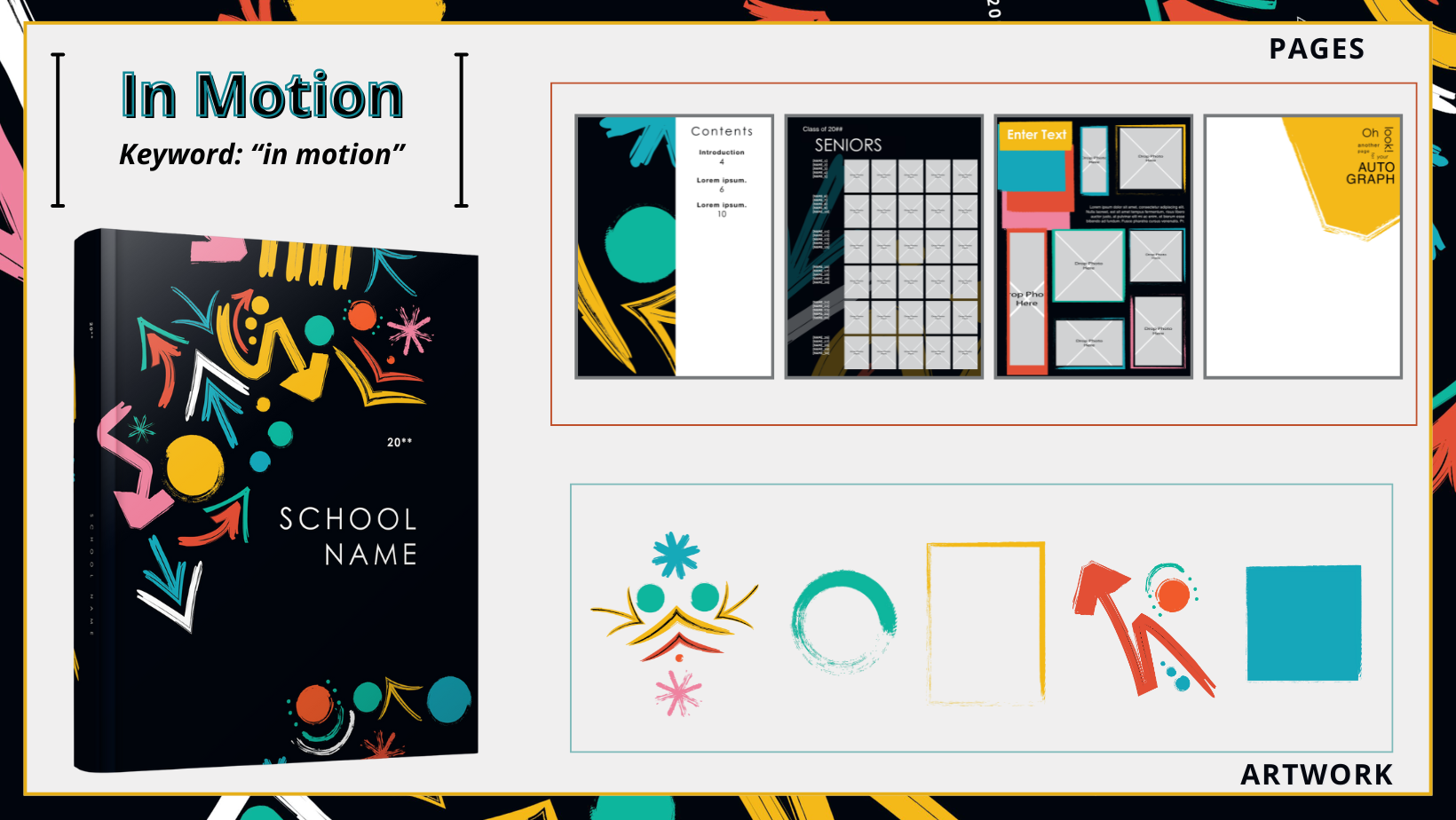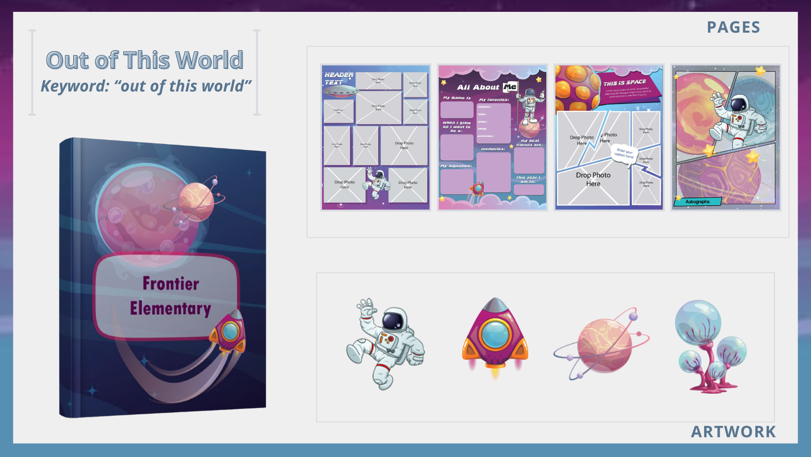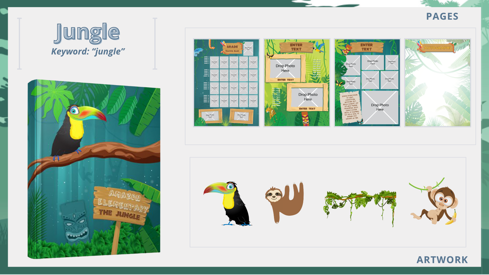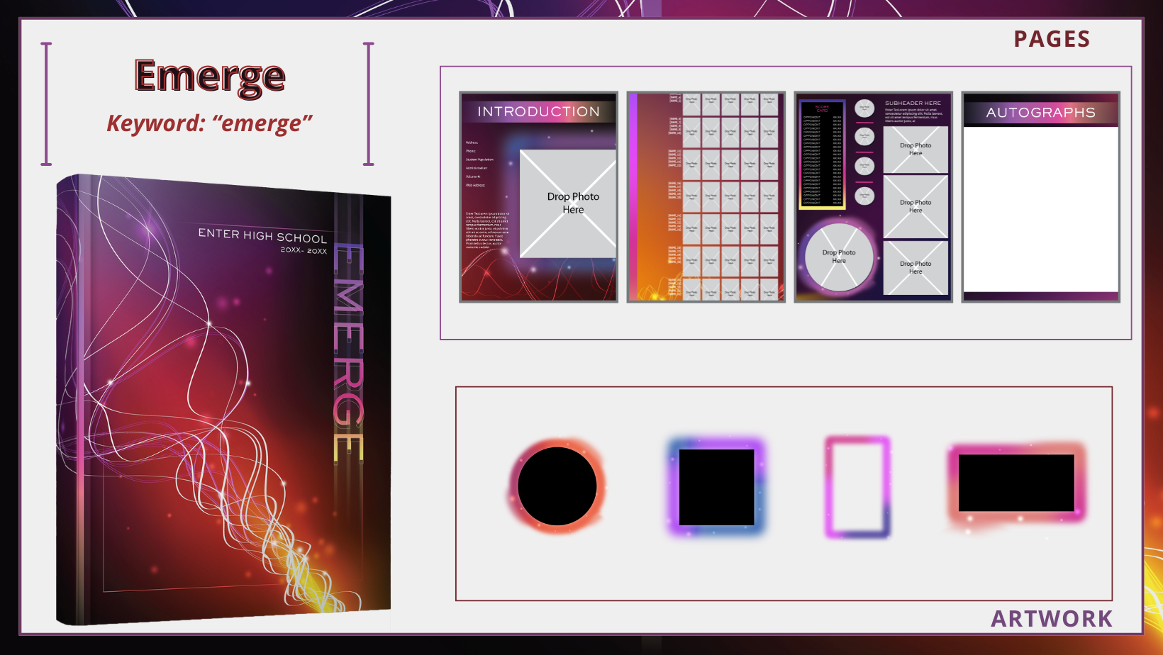 Entourage Yearbooks’ designer, EDOnext, has hundreds of templates and themes to customize and use for your yearbook design. Here are some of our easy-to-use themes and their search words to find them in the designer!